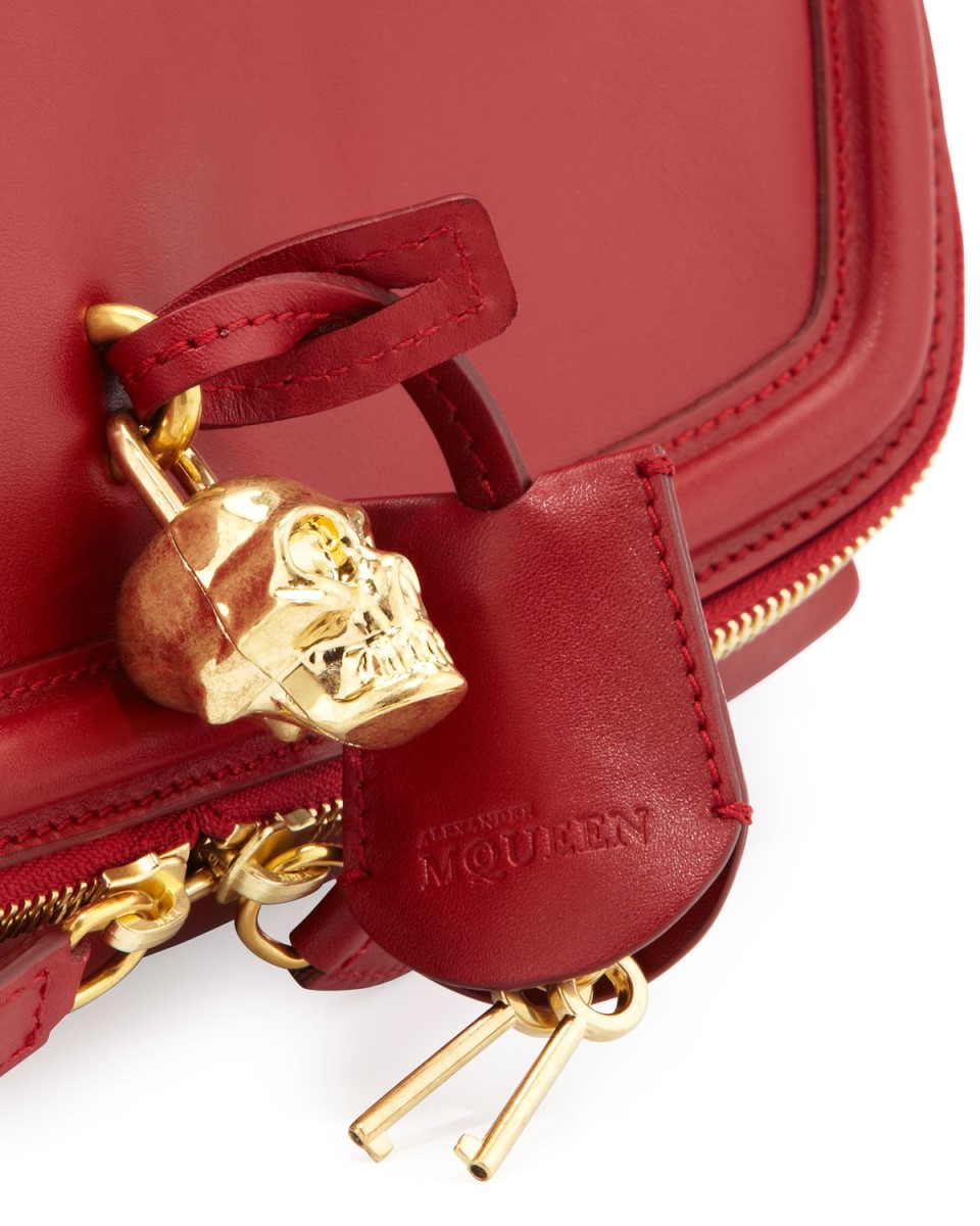 Lynlås og et dekorativ gyldent kranie nøglering. Indvendigt et stort rum og 2 lommer. Stofbeklædning i sort.